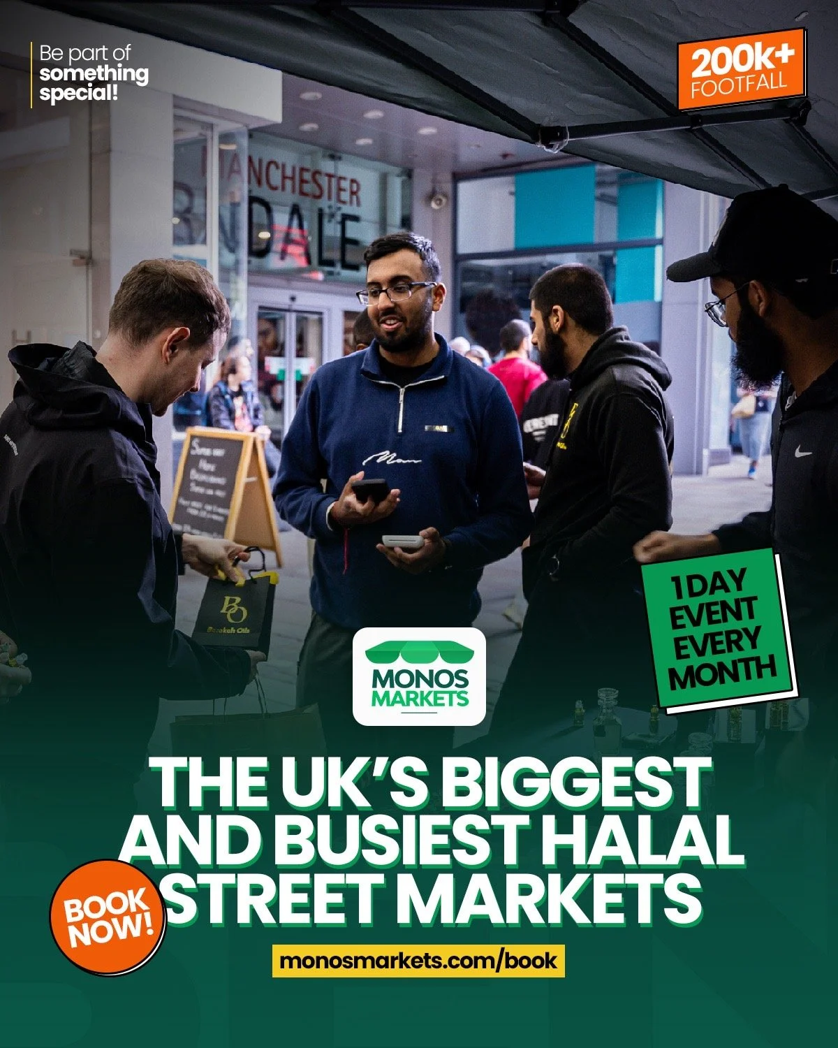 MONOS Markets – The UK’s Biggest and Busiest Halal Street Markets | 200k+ daily footfall | 300+ vendors | National wholesale contracts secured | 98% satisfaction rate | 90% vendor retention | Vendors expanded into permanent shops.